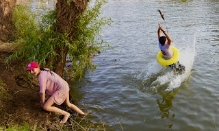 After cycling onward, we stopped to try out a tire swing. A car flew past, the occupants shouting “Mincha,” saying they needed two