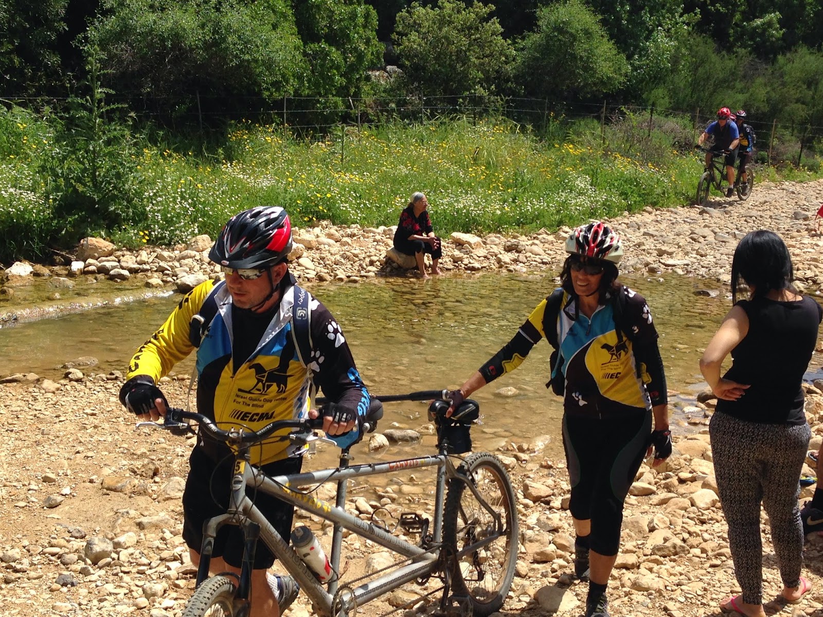 stream bed. He was riding a tandem bike and a second biker was seated behind